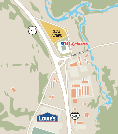Situated by a newly opened Lowes Home Improvement Center and Walgreens Drug Warehouse, this 2.75 acre opportunity with its unique, double-front location provides great visibility from I-540/US 71, offers terrific access, a beautiful mountain backdrop, and provides a rare opportunity for any retailer in this highly desirable market.